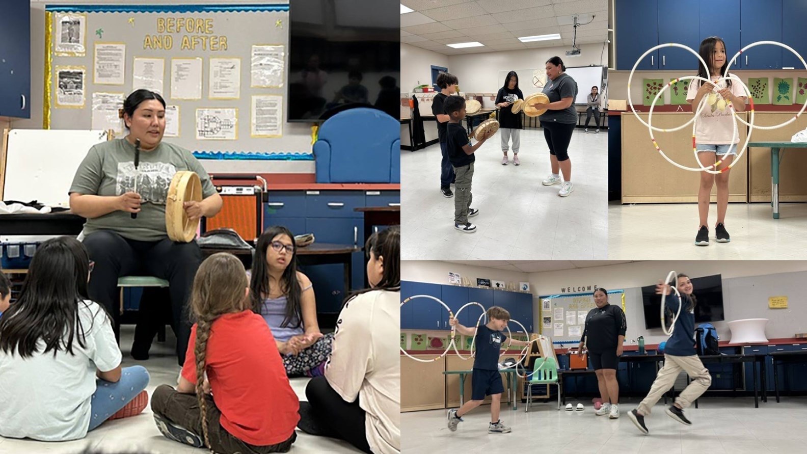 During their weekly visits, Elder Jennifer and Rose guide students through a variety of cultural teachings. Older students explore teepee teachings, younger ones listen to traditional stories, and all grades take part in activities like sewing ribbon skirts and shirts, drumming, dancing, and sage picking. Each activity offers a meaningful way to connect with culture and community.