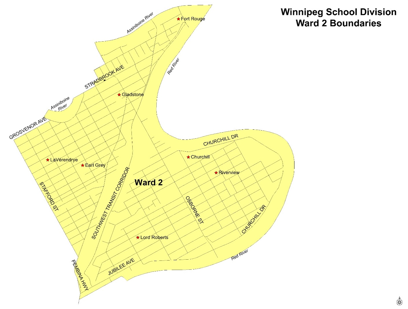 From South Division boundary (south side of Jubilee Ave), north along Pembina Hwy to Stafford St, north along extension of Stafford St, continue north on Stafford St to Grosvenor Ave, east on Grosvenor Ave to Wellington Cres., north west along Wellington Cres. to 393 Wellington Crescent, north along the boundary between 393 & 475 Wellington Cres. to the Assiniboine River, east along the Assiniboine River to continuation of Stradbrook Ave (cross between 141 & 155 Wellington Crescent), continue east along Stradbrook Ave to Nassau St N, east to Norquay St (north of Stradbrook Ave), north along Norquay St to River Ave, east along River Ave to Osborne St, north along Osborne St to the Assiniboine River, east along the Assiniboine River to the Red River, south along the Red River to the South Division boundary (south of Jubilee Ave), west along south side of Jubilee Ave to Pembina Hwy.