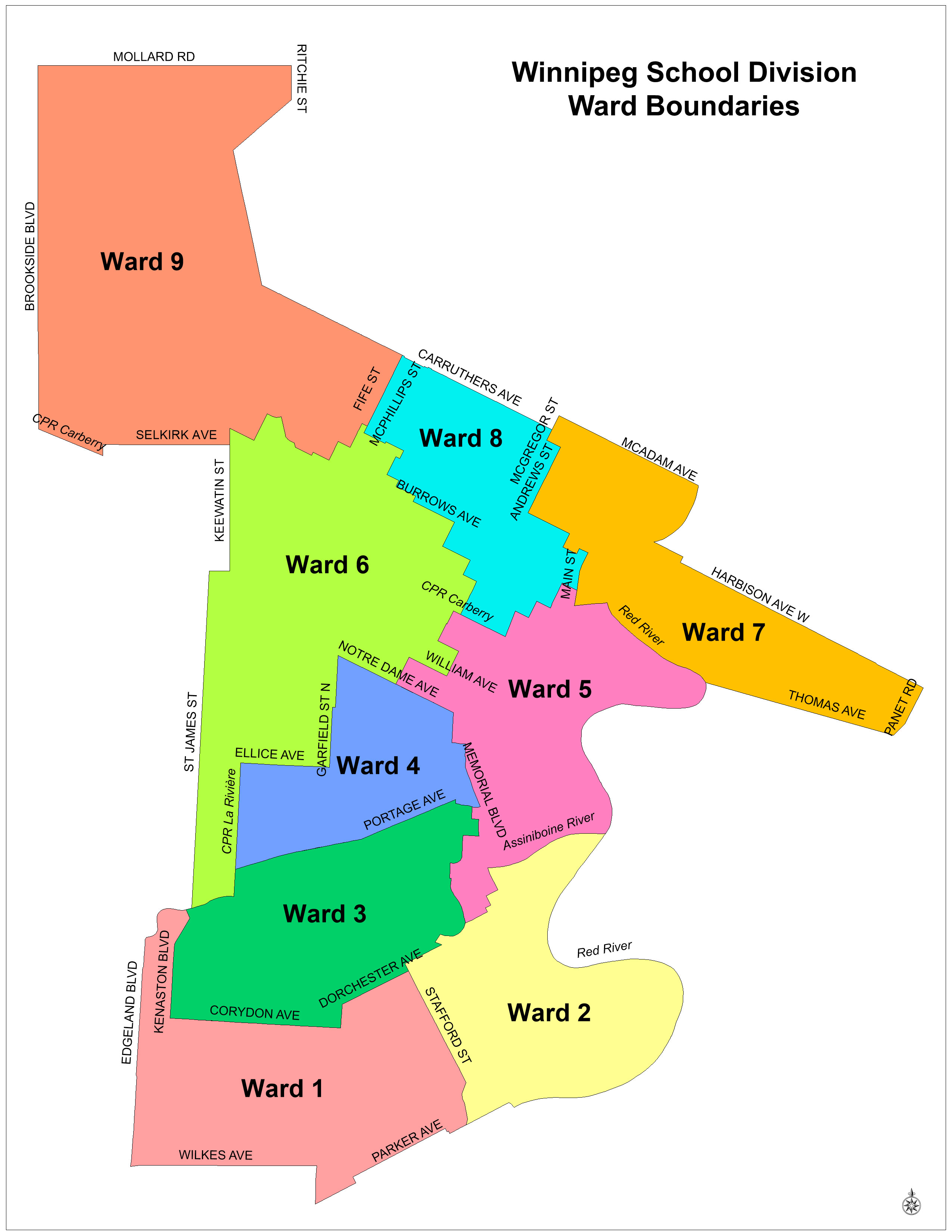 From Pritchard Ave, north on Main St to College Ave, north west on College Ave to Charles St, south on Charles St to Boyd Ave, north west on Boyd Ave to Aikins St, north on Aikins St to Mountain Ave, north west on Mountain Ave to Andrews St, north on Andrews St to Inkster Blvd, north west on Inkster Blvd to McGregor St, north on McGregor St to North Division boundary (north side of McAdam Ave), east along North Division boundary to Red River, south along Red River to Elmwood Park, east along North Division boundary of Elmwood Park to Henderson Hwy, south along Henderson Hwy to Harbison Ave W, east along Harbison Ave W (both sides) and Harbison Ave E (both sides) (Division boundary), continue east along extension of north side of Harbison Ave E to Panet Rd, south along Panet Rd to Division boundary (south of Thomas Ave extension), west along Division boundary (south of Thomas Ave) to Red River, north along Red River to extension of Pritchard Ave, west on Pritchard Ave to Main St.